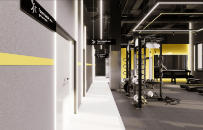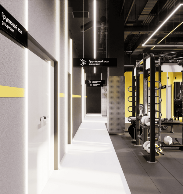 Нашим основными козырями стали цвет и свет. За основу мы взяли фирменные цвета фитнес-клуба жёлтый и тёмно-серый. Чтобы разбавить темную цветовую гамму мы использовали светло-серый, почти белый оттенок в окраске части стен.