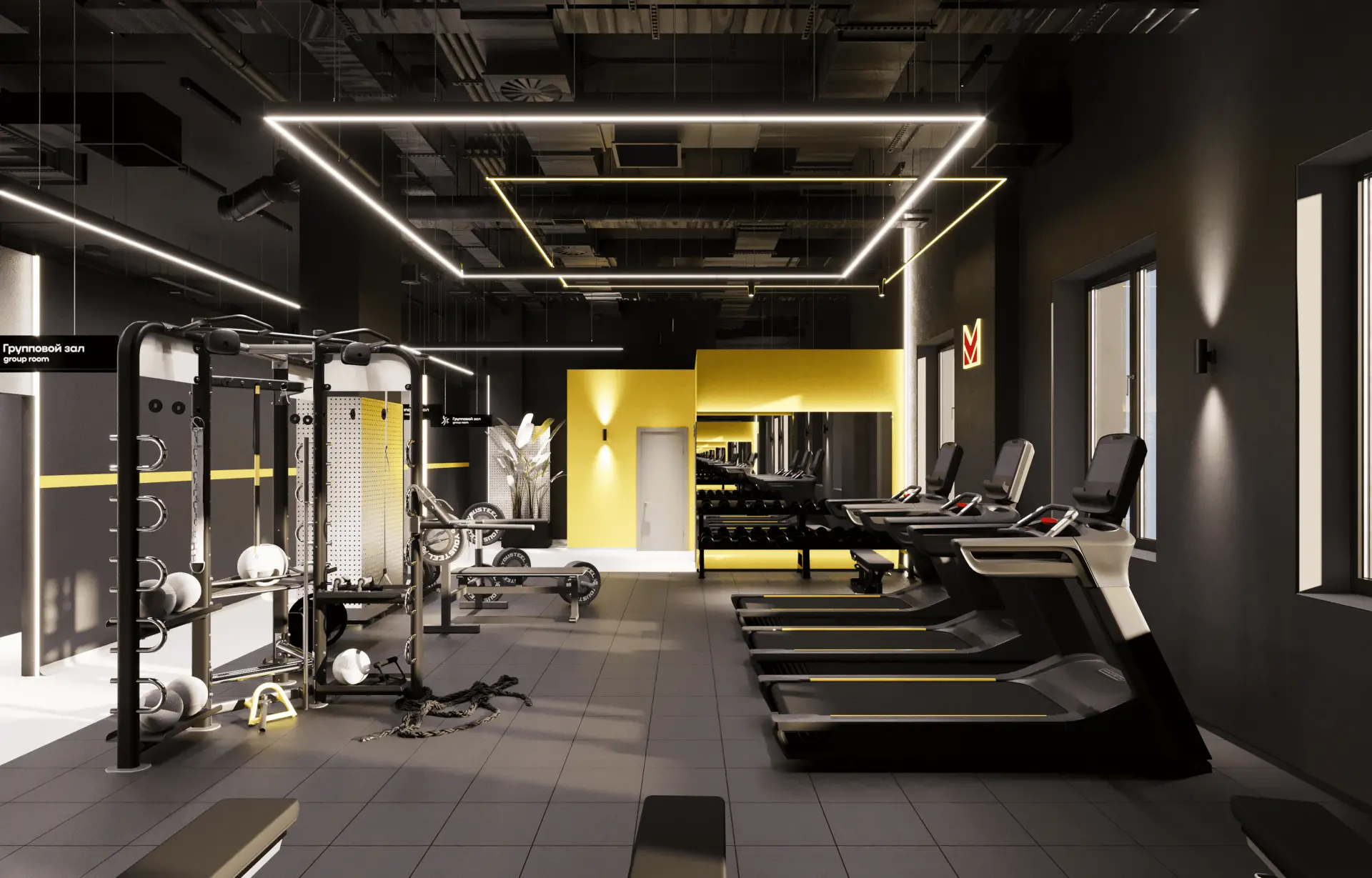 Также мы использовали акцентные спотовые (направленные на пол) светильники, которые интересно смотрятся в большом пространстве фитнес зала.
