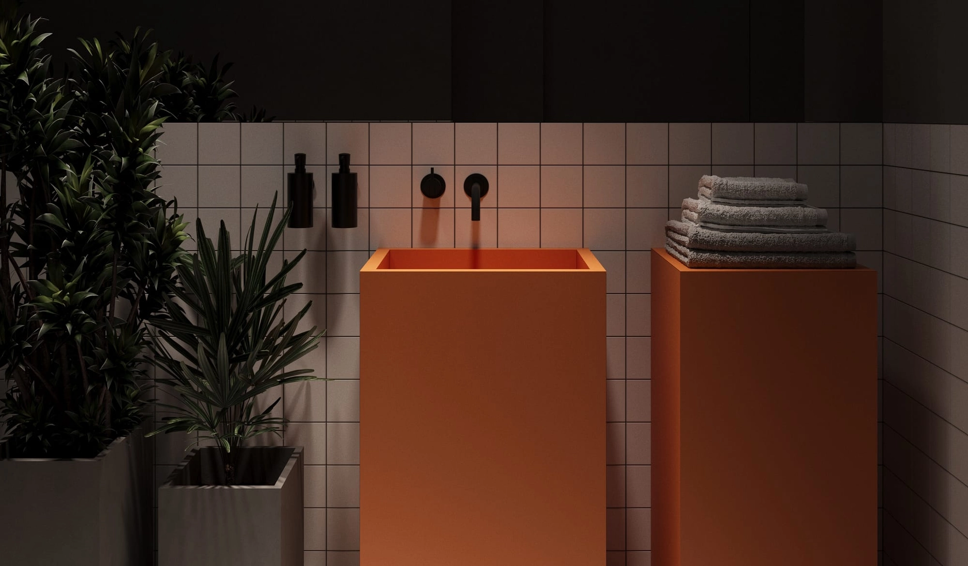 Раковина выполнена из цветного, российского керамогранита Estima Моноколор. Такую же форму и размер имеет пъедестал для полотенц рядом. Поскольку место в помещении позволяет разместить отдельный пъдестал вместо обычных небольших навесных полок для полотенец.