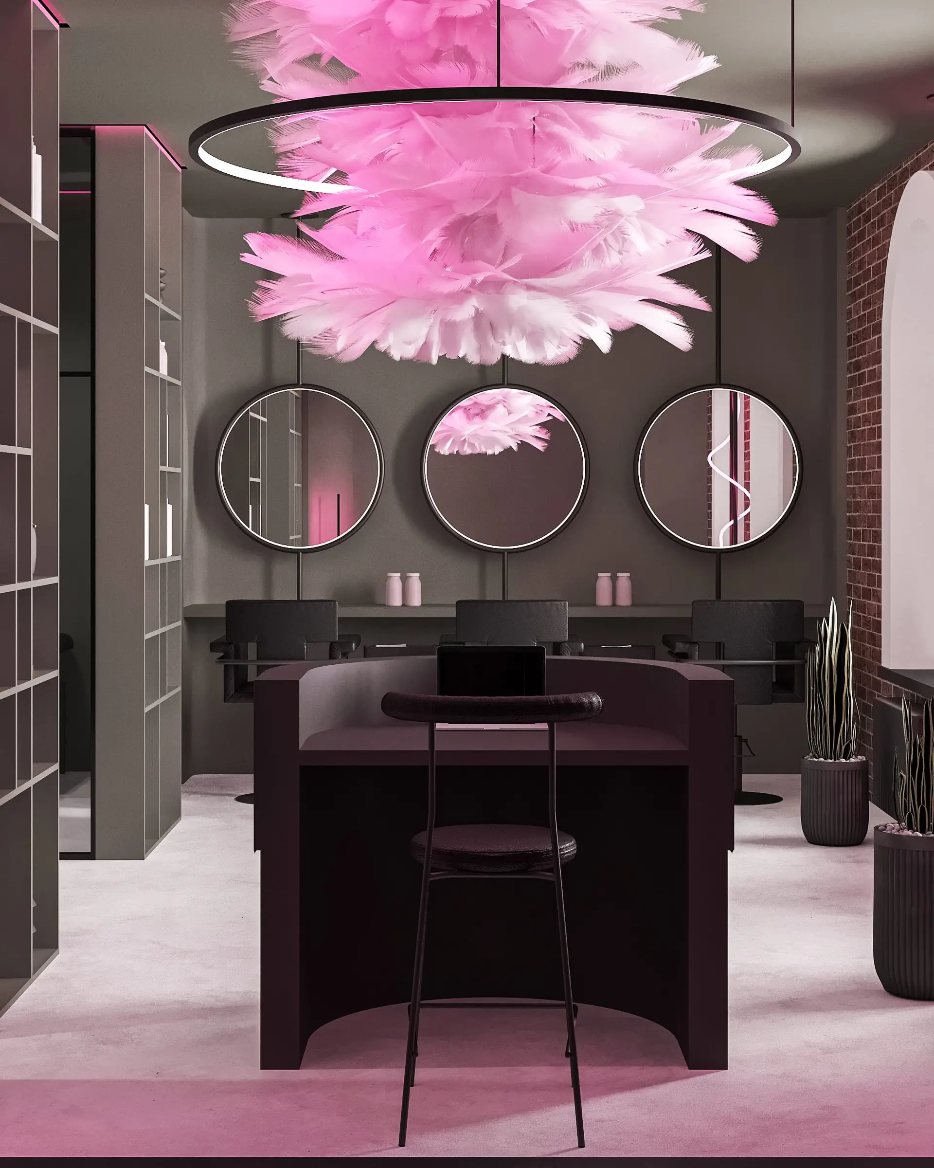 В общем зале находятся: парихмахерские кресла в один ряд с круглыми зеркалами, диван для ожидания и стойка администратора с необычной акцентной люстрой из перьев.