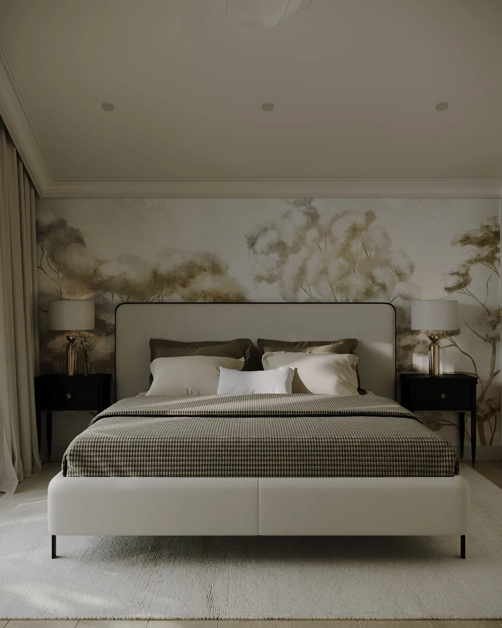 Двухэтажный загородный дом с кухней-гостиной, спальней и двумя санузлами. Светлое пространство преимущественно в бежевых спокойных оттенках с добавлением бирюзы, лепнины и классических элементов.