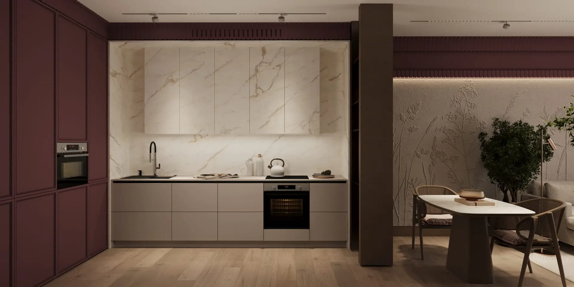 По всему периметру гостиной и кухни идет уникальный элемент отделки - рельефный карниз, выкрашенный в блогородный цвет бордо. Цвет "переходит" на фасады кухни.