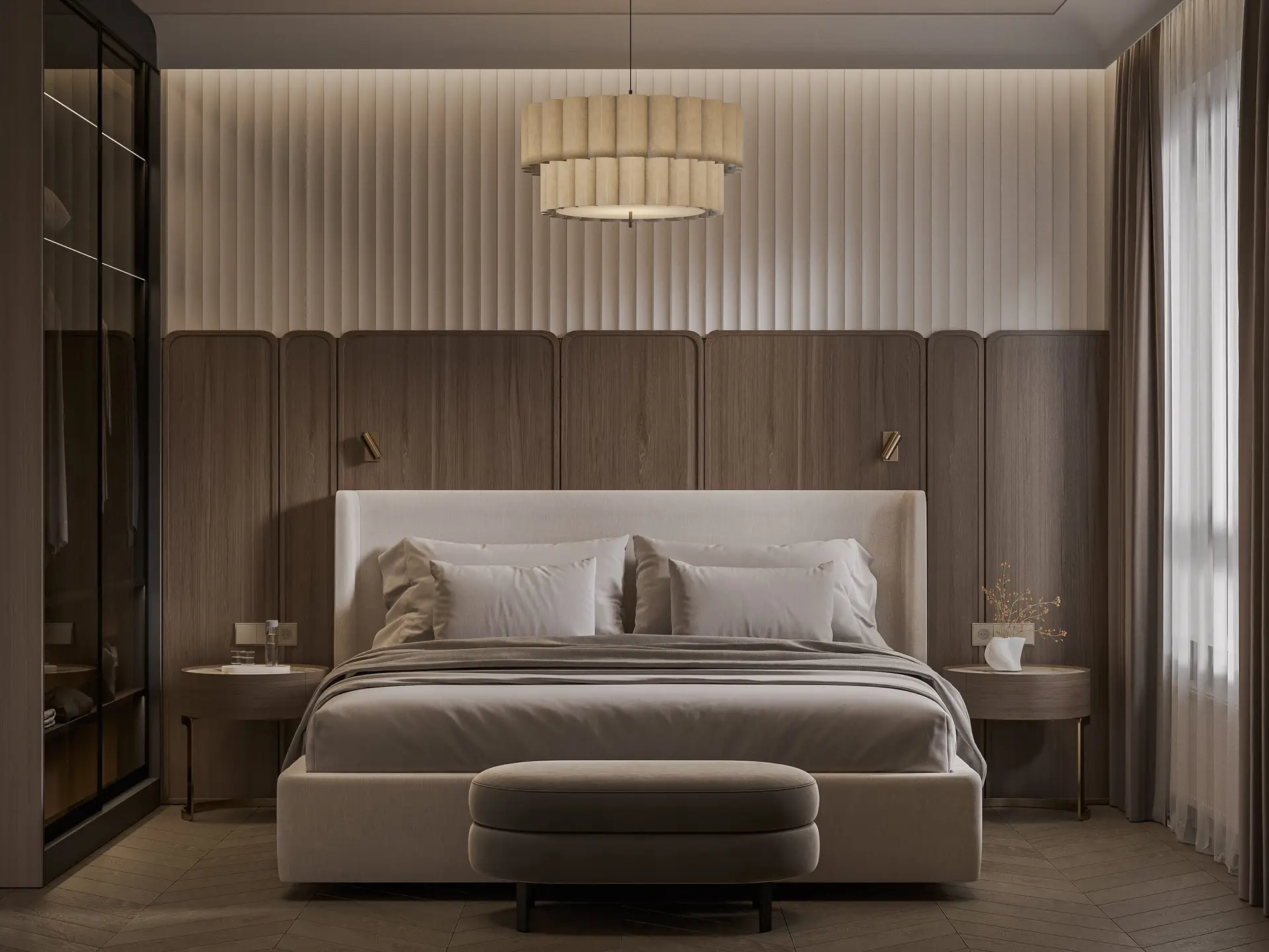 За кроватью рельефные мебельные панели с имитацией тканевых.
