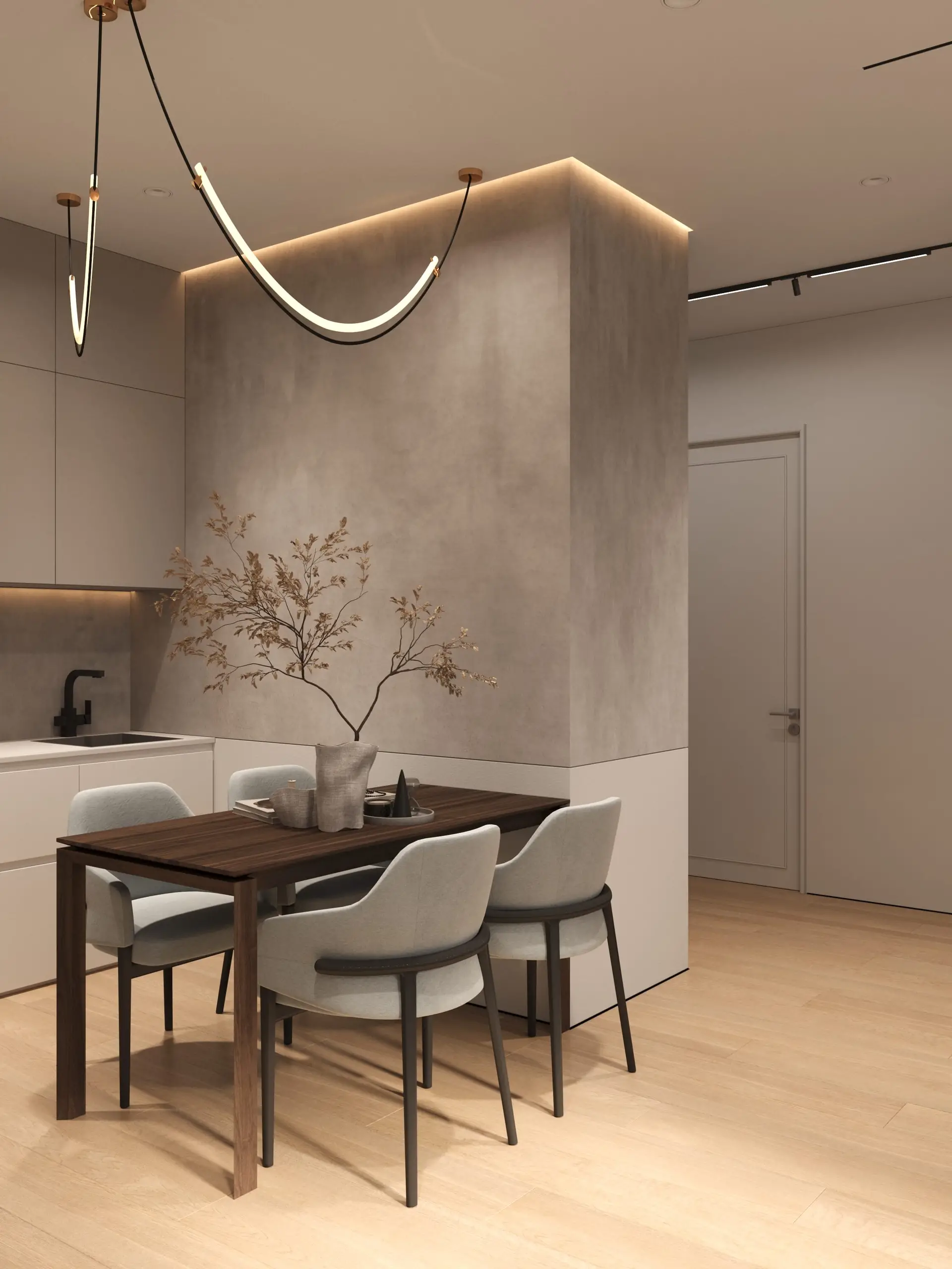 Отделка кухонного фартука в микроцементе переходит на стену. В этом же материале выполнена стена за ТВ. Стулья, диван и ковер разбавляют пастельную гамму, вносят в интерьер динамику и глубину. Изящный декор в виде панно на стене, светильников и журнального столика привносит в интерьер изюминку.